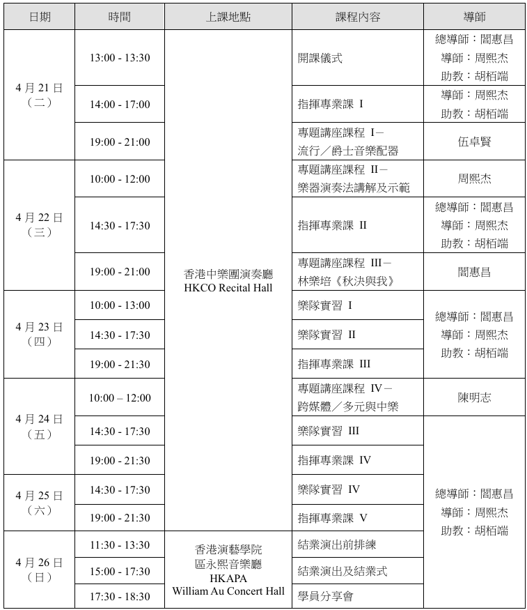 正式學員已於 2026 年 2 月 7 日 截止報名,而旁聽學員和觀摩學員則於 2026 年 3 月 10 日 截止報名。請填妥報名表,並附上個人正面指揮影音片段 1-2 份(僅限正式學員),電郵至hkco.program@hkco.org。錄取為正式學員的人士會於 2026 年 3 月初 獲得主辦方通知。獲錄取者,樂團將提供上課使用之總譜(請學員簽署版權聲明,本次提供之作品僅作為指揮大師班上課之用,日後如需公開售票演奏,請自行與作曲家處理版權事宜)。